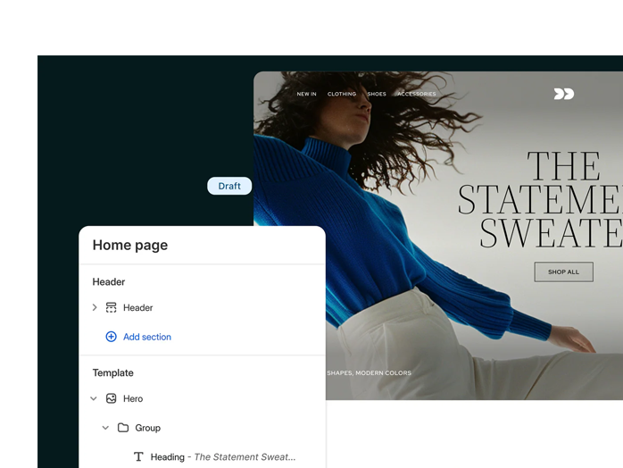 Tableau de bord clair, éditeur glisser-déposer, configuration guidée : tout est pensé pour simplifier la création et la gestion de la boutique.